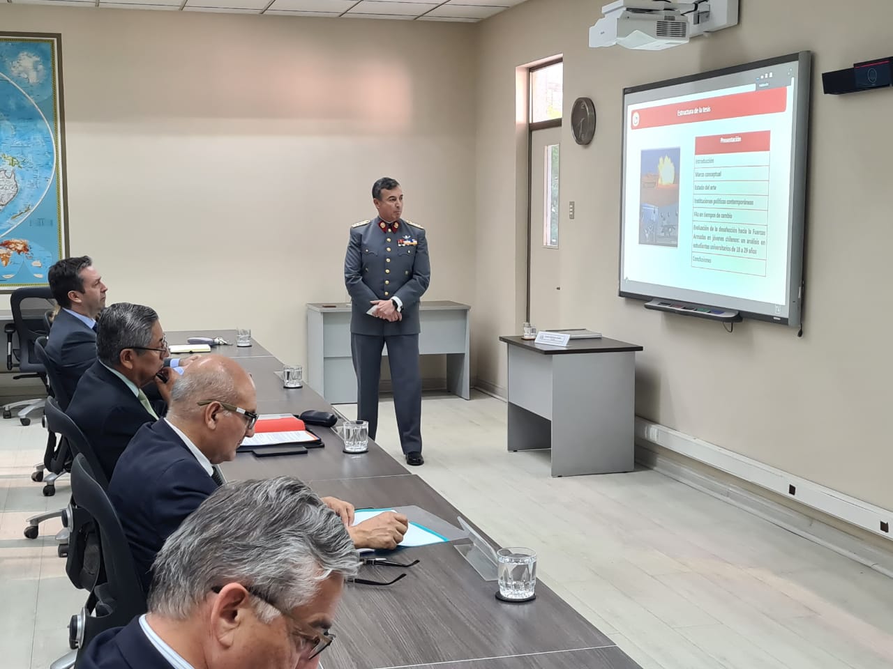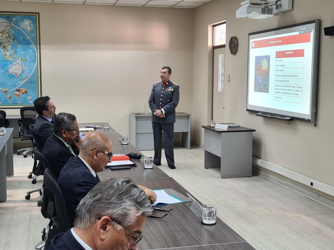 En el marco del programa de Doctorado en Seguridad y Defensa, la Academia Nacional de Estudios Políticos y Estratégicos llevó a cabo una nueva defensa de tesis doctoral. En esta ocasión, el Coronel de Ejército Álvaro Inostroza presentó y defendió su investigación ante la Comisión Evaluadora, conformada por el Dr. Ariel Álvarez de la ANEPE; el Dr. Cristián Garay, de la Universidad de Santiago de Chile; y el Dr. Jaime Abedrapo, de la Universidad San Sebastián.